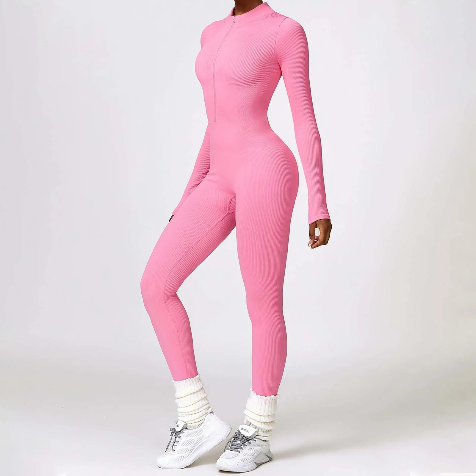 Women's Solid Color Seamless Yoga Jumpsuit Long Sleeve Trousers Zipper Tight Tracksuit