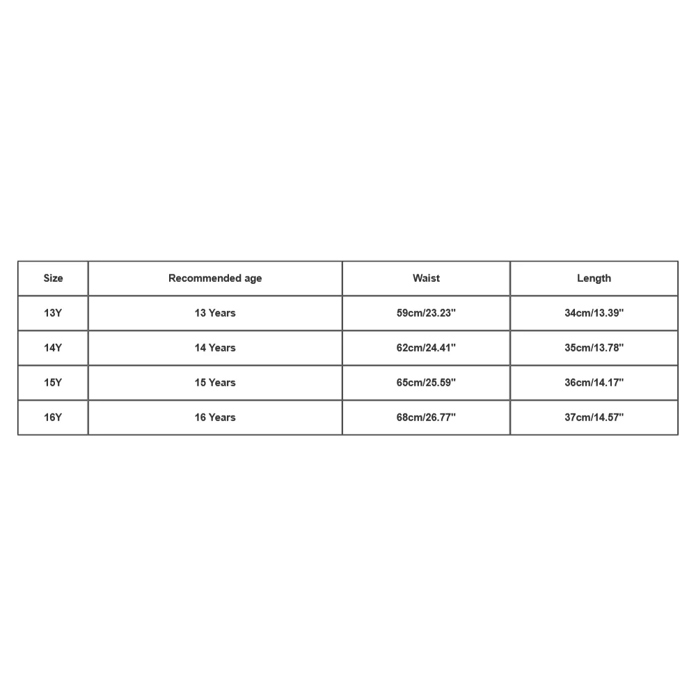Size:13Y Recommended age:13 Years Waist:59cm/23.23'' Length:34cm/13.39''