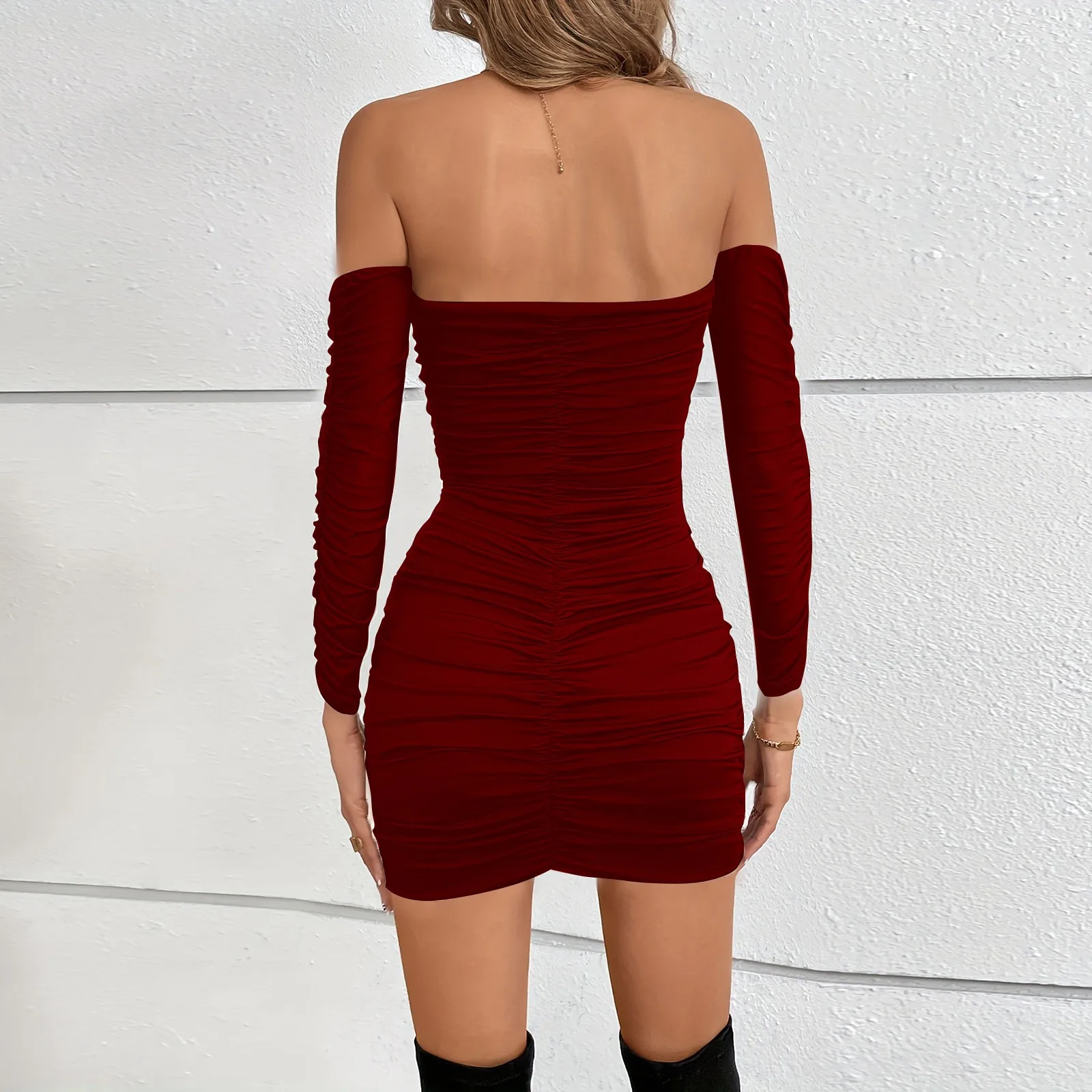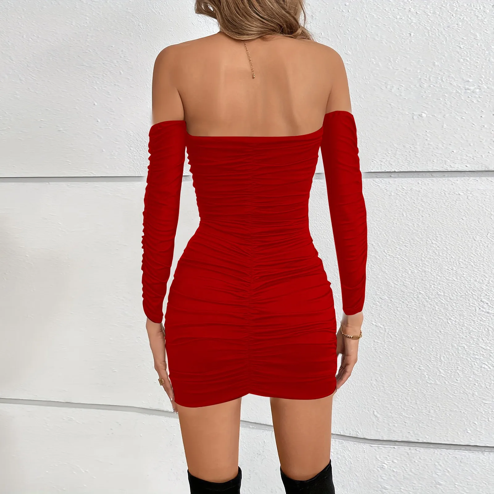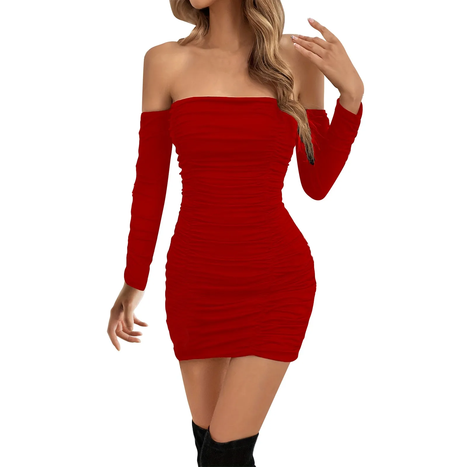 Women's Dresses One Neck Long Sleeve Pleated Temperament Wrap Hip Dress Sexy Wrap Chest Dresses