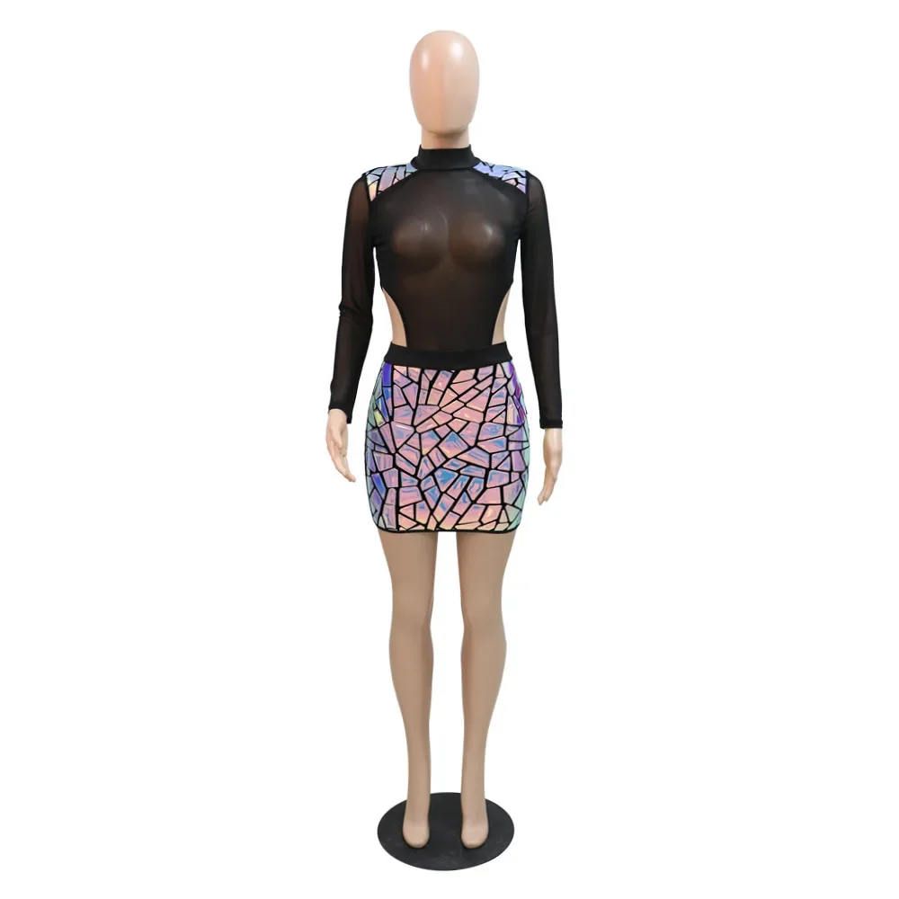 Women Full Sleeve Sequined Tassel Mini Dress Mesh See Through Sexy Evening Night Club Party Dresses Vestidos 2024 Autumn