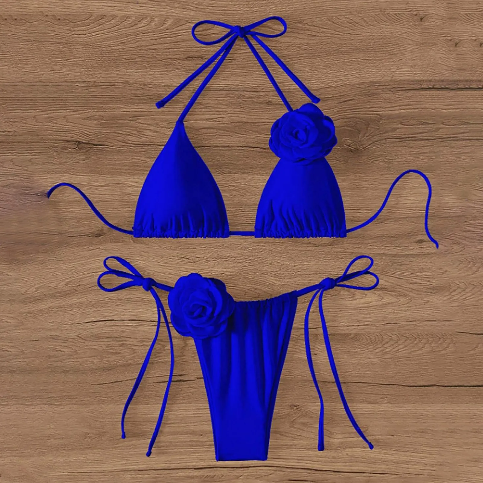Halter 3D Rose Flower Decor Brazilian Bikini Women Sexy Low Waist Lace Up Split Two Pieces Swimwear Female Bathing Suits Swim