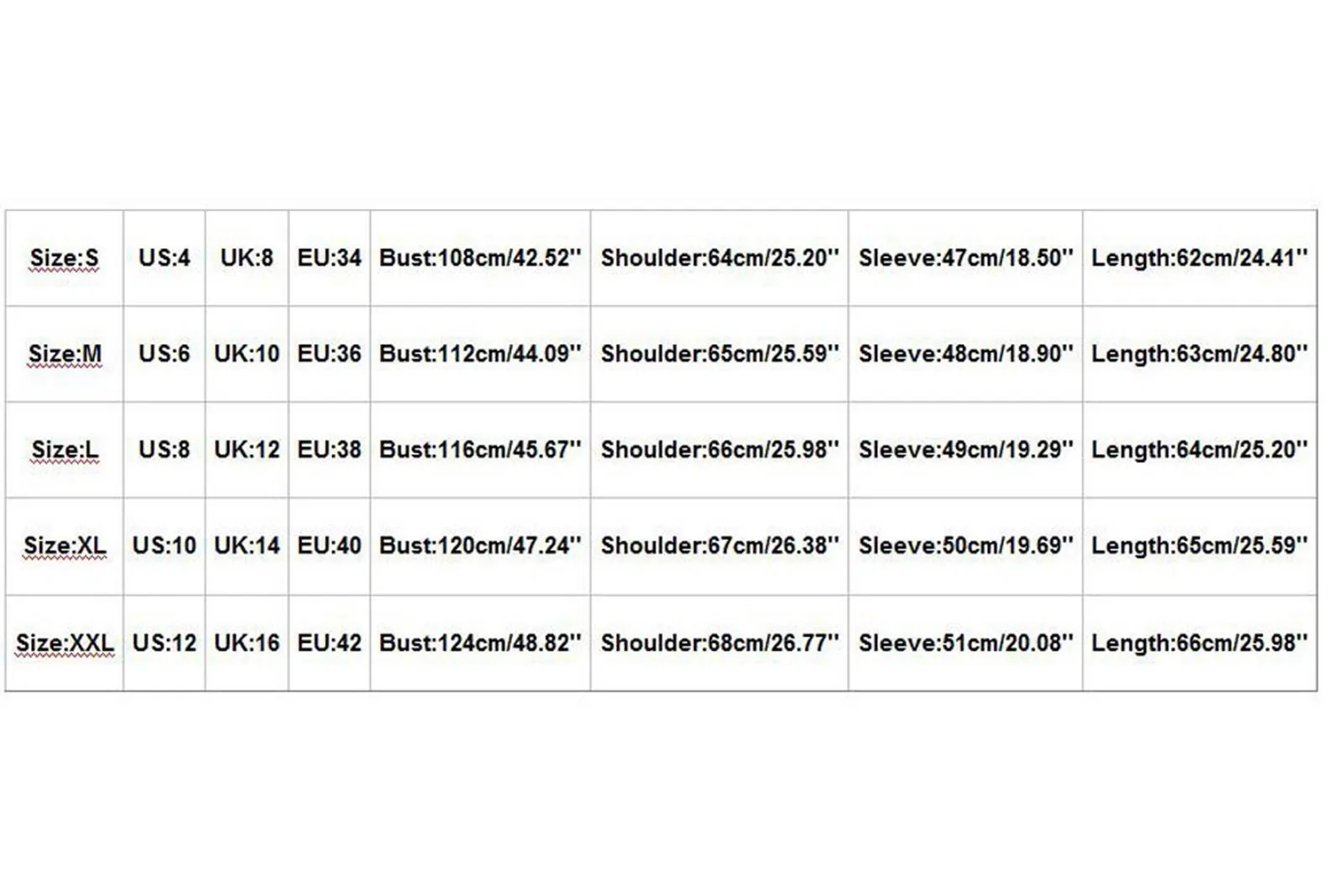 | Size:XL | US Size:12 | UK Size:16 | EU Size:40 | Bust:120cm/47.24'' | Shoulder:67cm/26.38'' | Sleeve:50cm/19.69'' | Length:65cm/25.59'' |