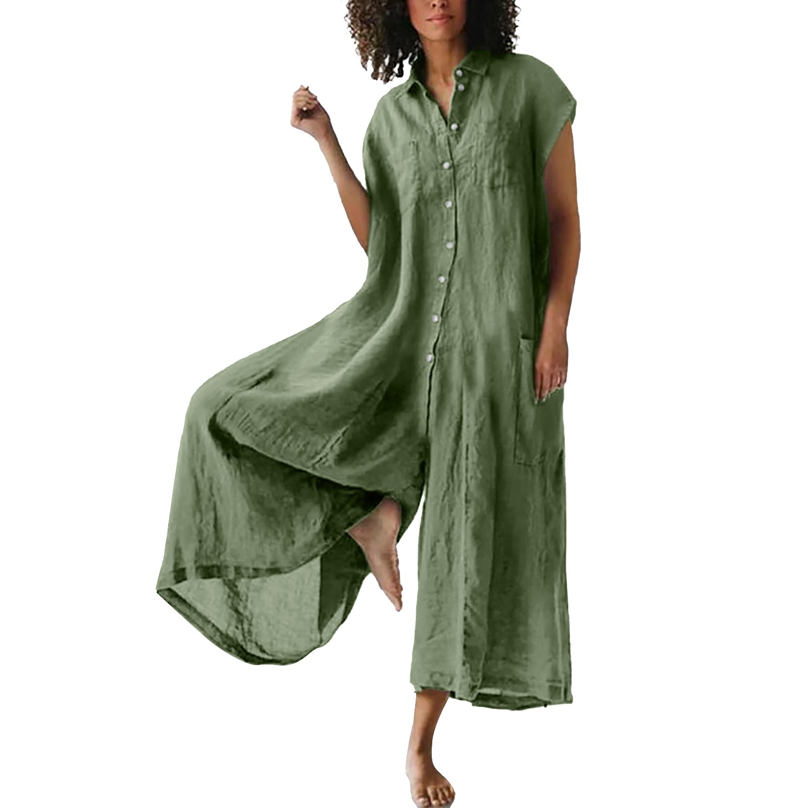 Women's solid colour casual short sleeve mid length cotton linen shirt jumpsuit