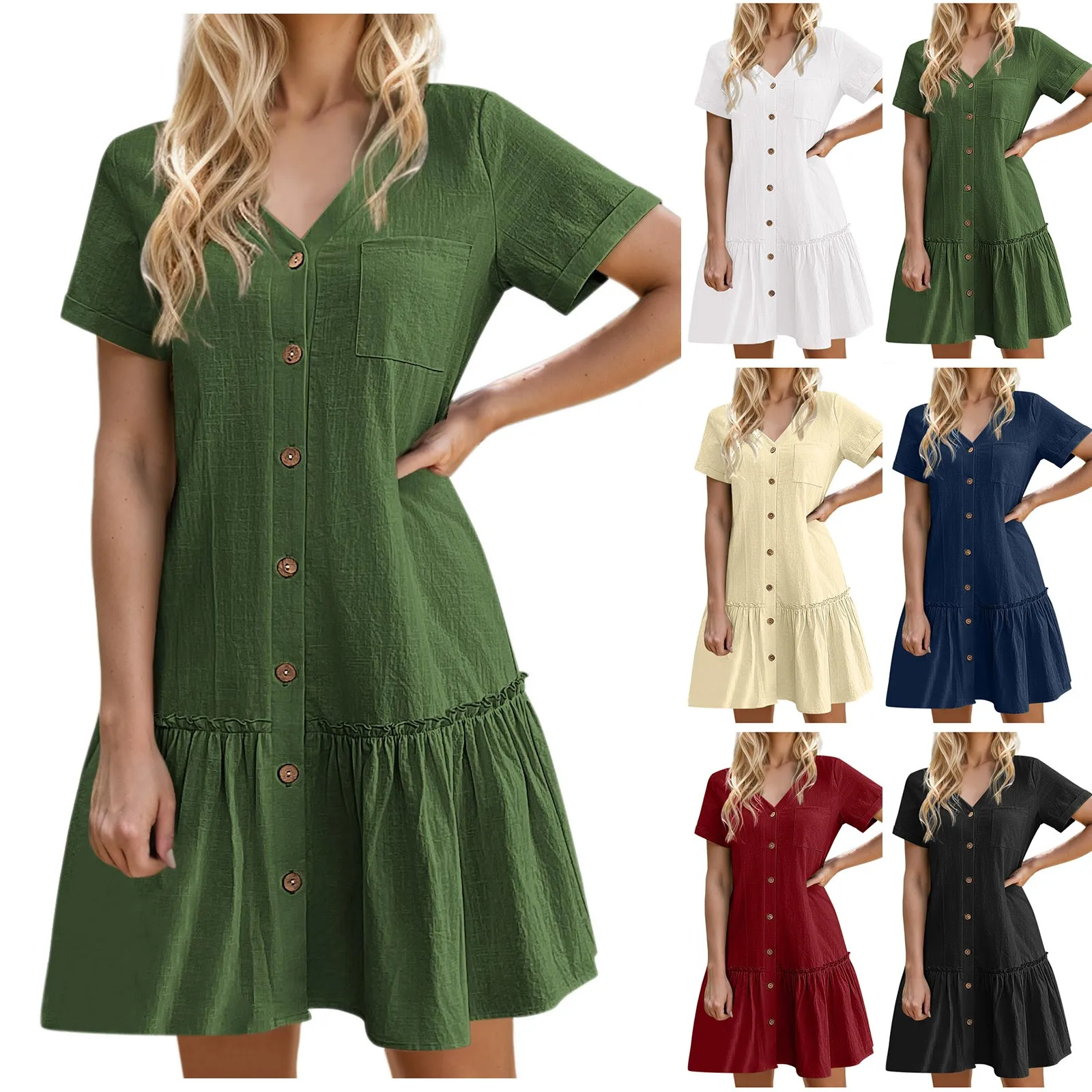 Female Dresses Outfits Women Button Down Dress Loose Summer Cotton Linen Shirt Dress Ruffle Casual Tunic Dress платье женское