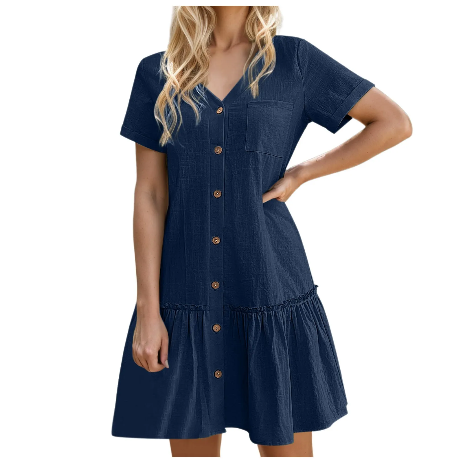 Women Button Down Dress Loose Summer Cotton Linen Shirt Dress Ruffle Casual Tunic Dress