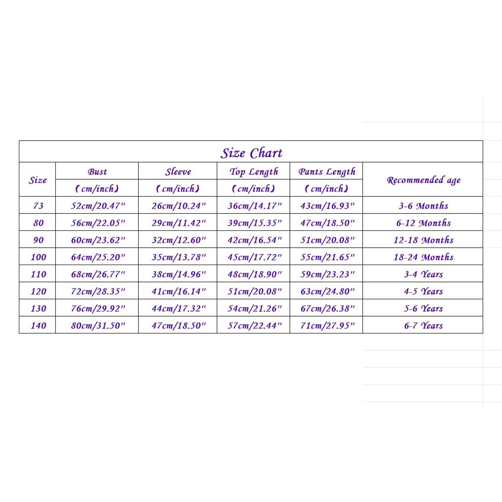| Size | Bust | Sleeve | Top Length | Pants Length | Recommended age |