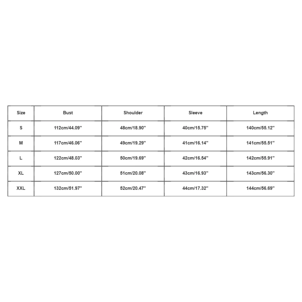 | Size:XXL | Bust:132cm/51.97'' | Shoulder:52cm/20.47'' | Sleeve:44cm/17.32'' | Length:144cm/56.69'' |