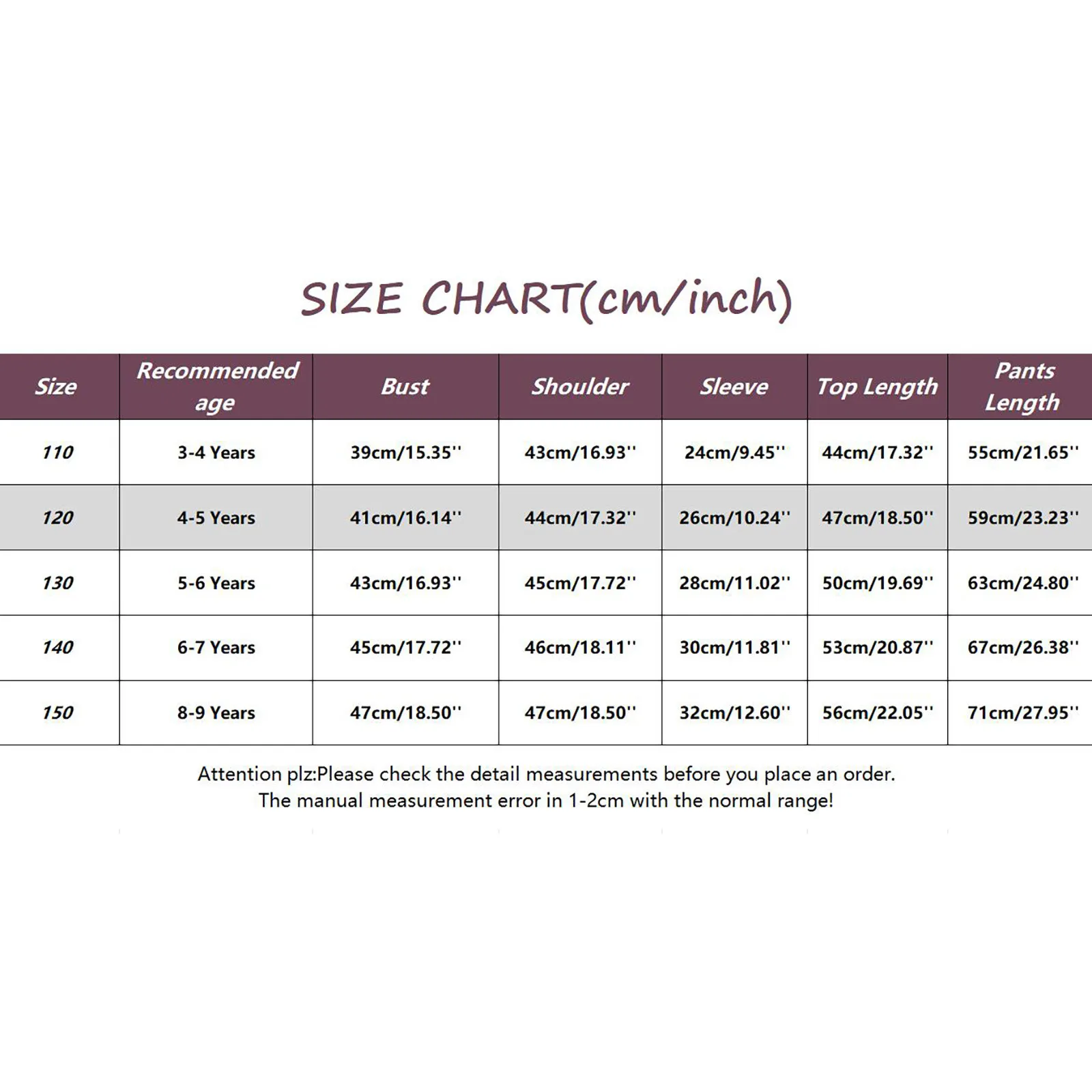 Size:120 Recommended age:4-5 Years Bust:41cm/16.14'' Shoulder:44cm/17.32'' Sleeve:26cm/10.24'' Top Length:47cm/18.50'' Pants Length:59cm/23.23''